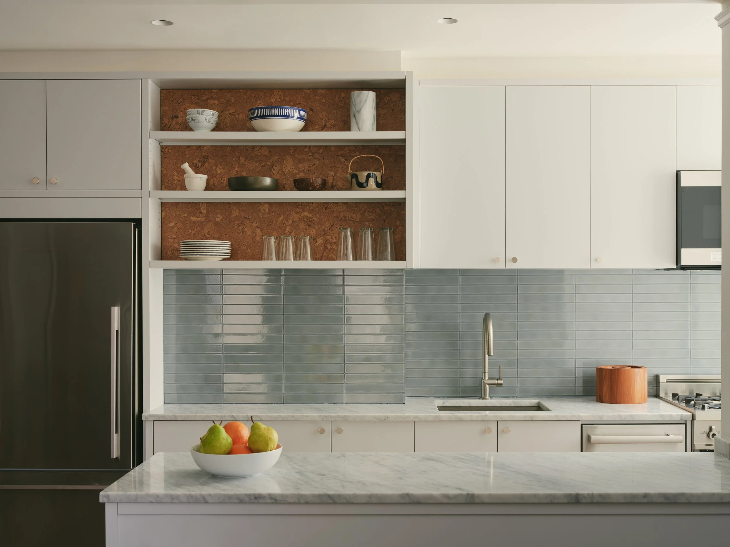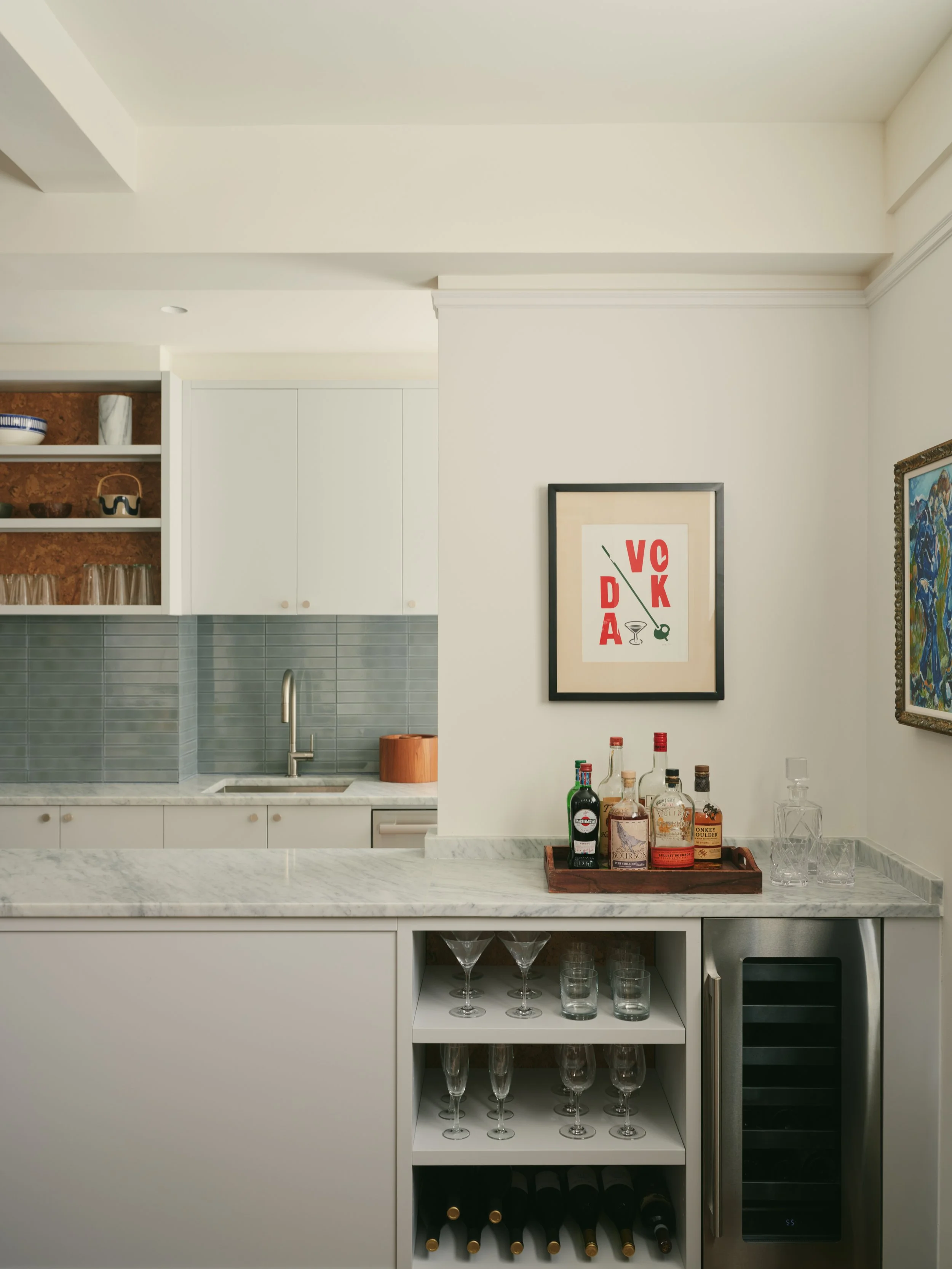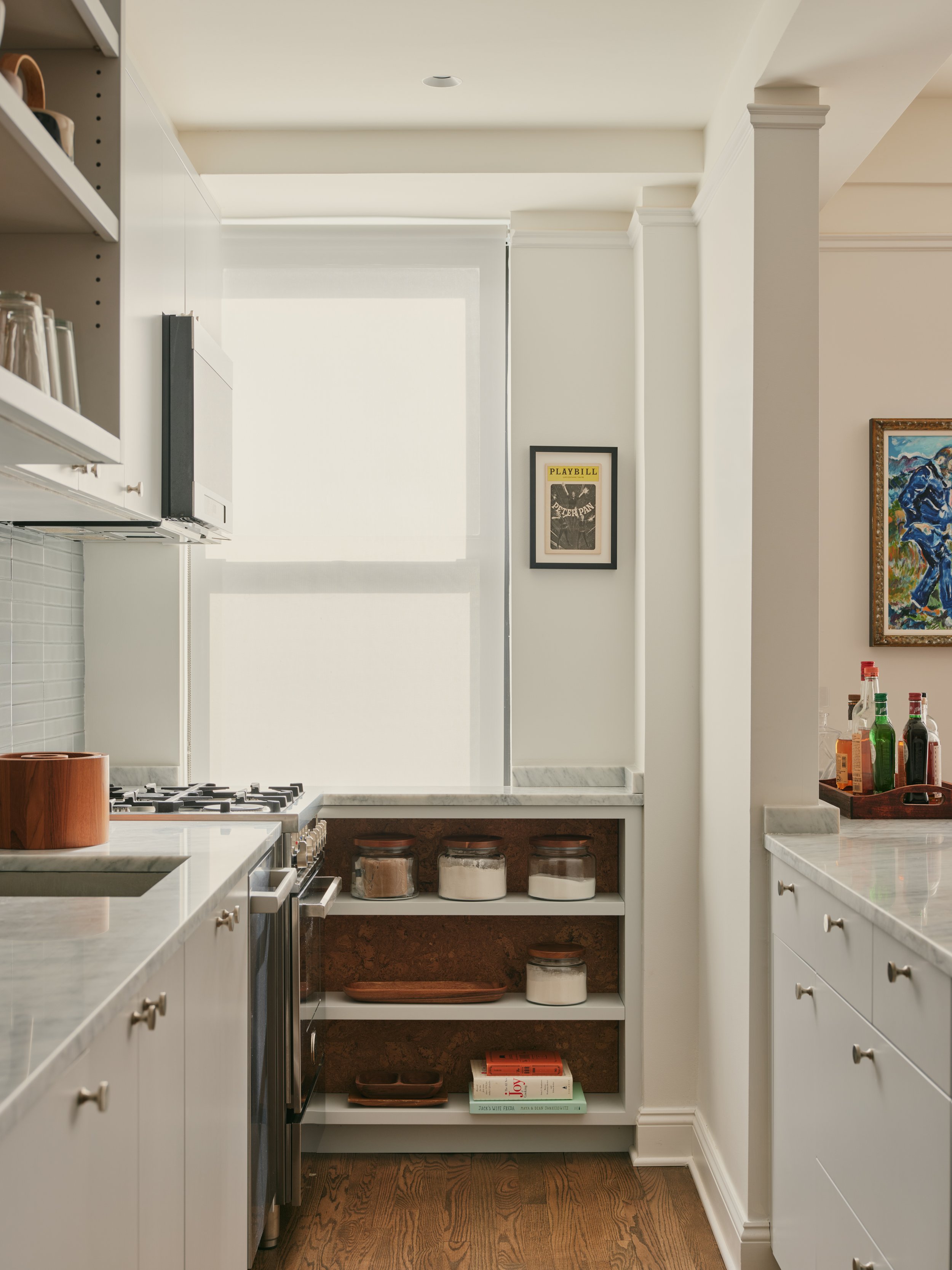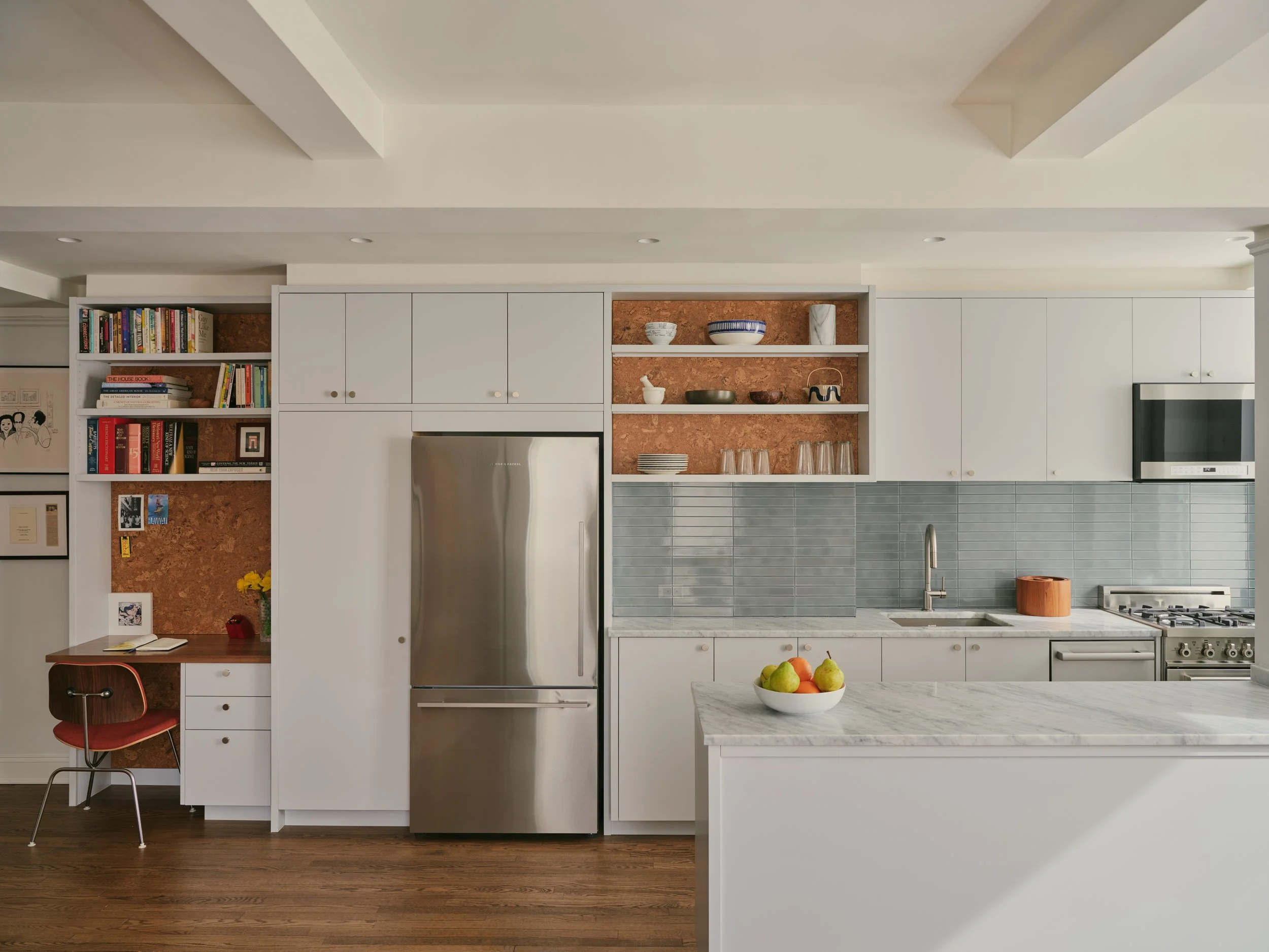 When we were hired to renovate a home in Manhattan’s Chelsea neighborhood, our clients asked us to rethink a typical NYC Pre-War apartment layout to better suit modern living, while maintaining the spirit of the place. The basis of our solution was to remove a number of walls and combine rooms to create a large common area. We also introduced a distinctively modern floor-to-ceiling wall cabinet that encompasses the kitchen, storage, and home office. What used to occupy a series of rooms is now arranged in a single piece of millwork, leaving much of the apartment as open space filled with natural light.
