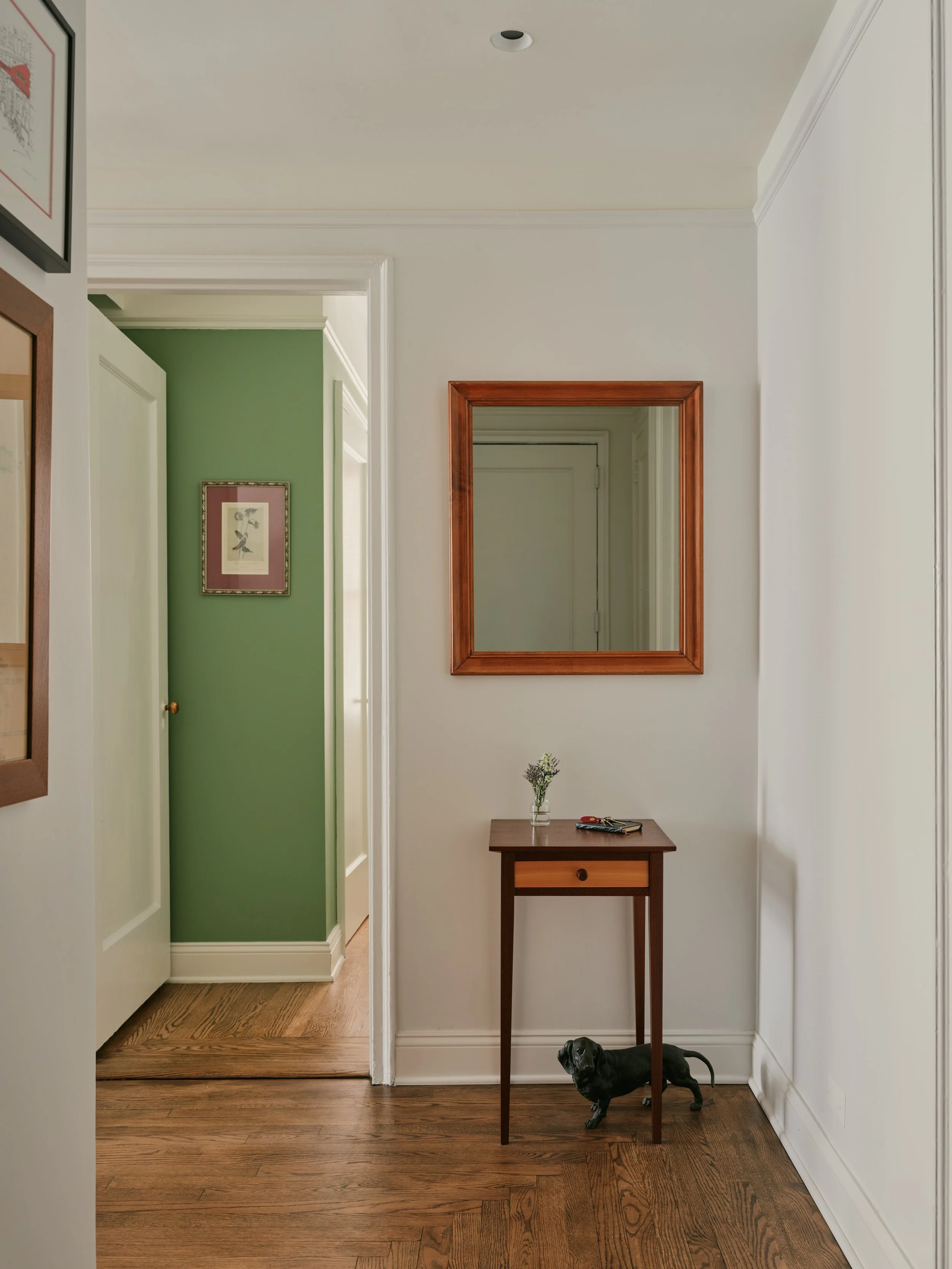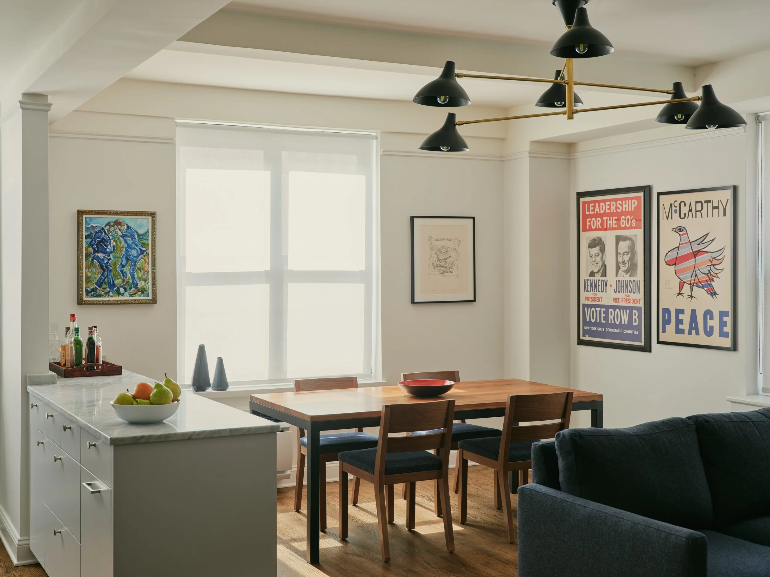 To maintain the Pre-War charm of the apartment, we selectively preserved and replicated some of the original building details. We also eliminated dropped ceilings that were not original to the apartment’s design, reintroducing greater ceiling heights and exposing the structural beams. That change created a perfect balance between quintessential Pre-War character and an urbane modern aesthetic.
